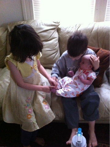 Brent came back in from looking for my birth stuff, and saw me on my hands and knees but facing the door. He asked if there was any way I could turn around (we had been through this issue before with Z). I kind of laughed and managed to turn so he could help catch baby.