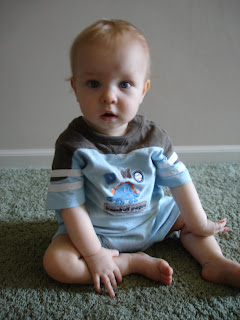 Here are some pictures of him on his birthday. The ones after the cake pictures are him in the morning. I was crawling across the floor in front of him calling his name to get him to look at me. Every time I tried to take his picture he would put his head down and crawl with his face in the floor so I couldn't get a picture. What a little tease. LOL!